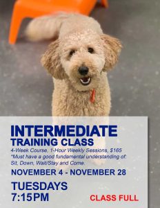 This Training Class is the next step after a dog graduates from Bark-A-Bout’s Beginner Training Class.