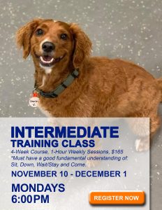 This Training Class is the next step after a dog graduates from Bark-A-Bout’s Beginner Training Class.